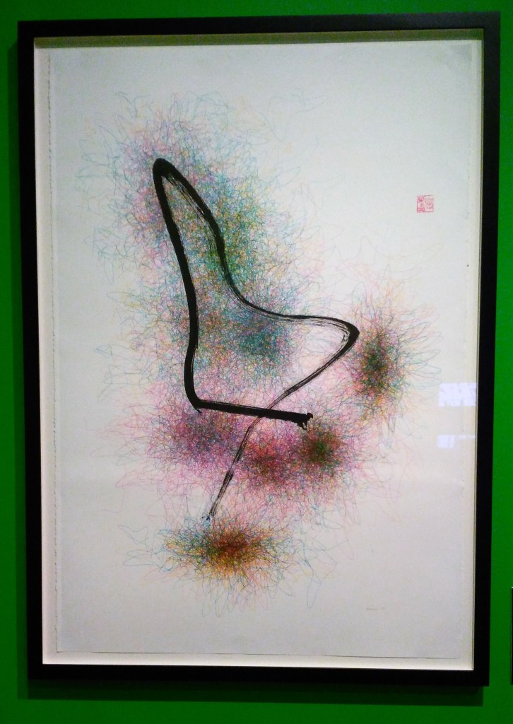 Verostko developed his own software to control a pen plotter before adapting the machine to hold a Chinese calligraphy inkbrush. The single black brushmark looks spontaneous but is actually plotter driven – it also uses the same gesture mark as all the smaller pen and ink lines. An algorithm dictates the shape, distribution and colour choice of each line.