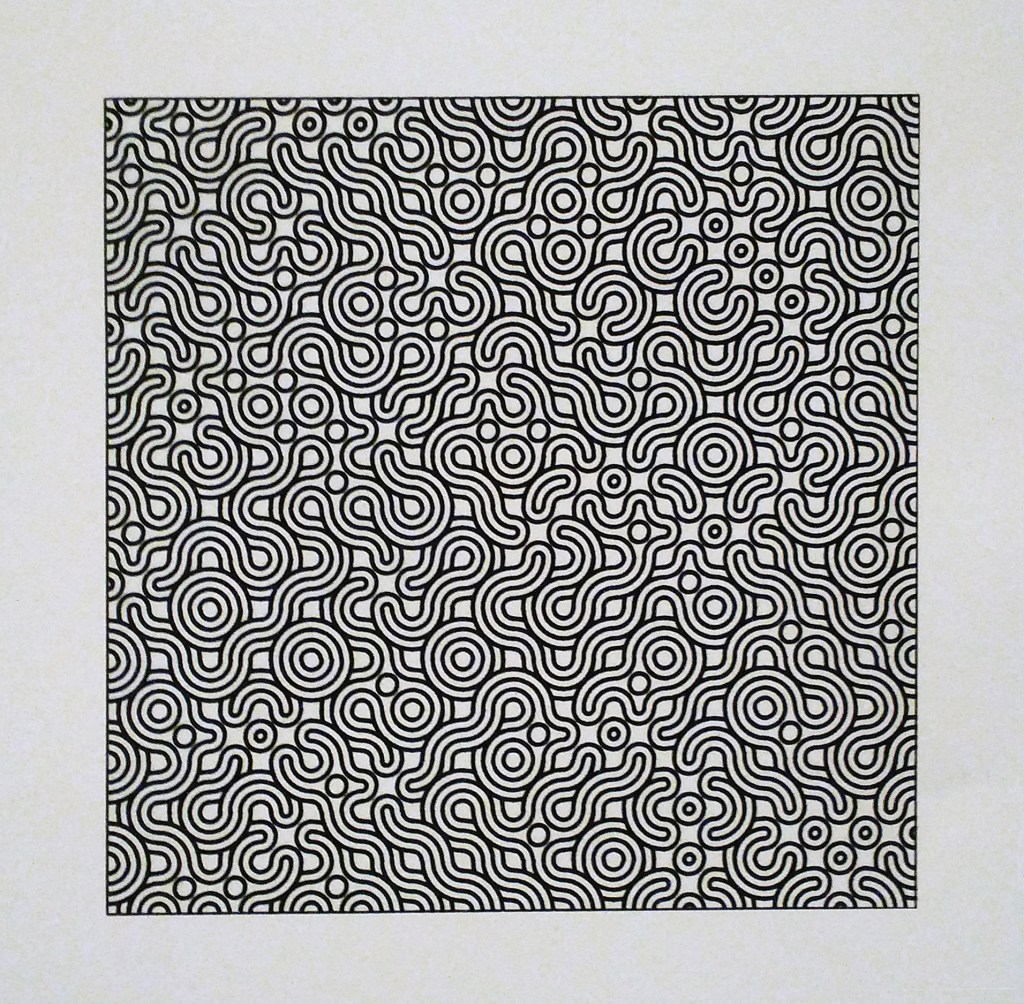 The linear forms in Brown’s computer generated drawings are made up of tiles or units which have been selected and rotated at random instead of being arranged in a repeating pattern. This adds a visual urgency to the overall work. Brown pioneered compter-based artwork at the Slade School of Fine Art in the 1970s.