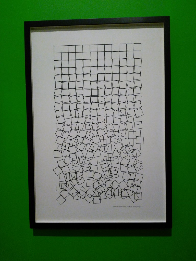 This screen print from a plotter drawing was inspired by Klee’s Highroads and Byroads, 1929. Nake produced an algorithm to make a computer-generated version by deliberatley writing random variables into the program to allow the computer certain choices within limited options.