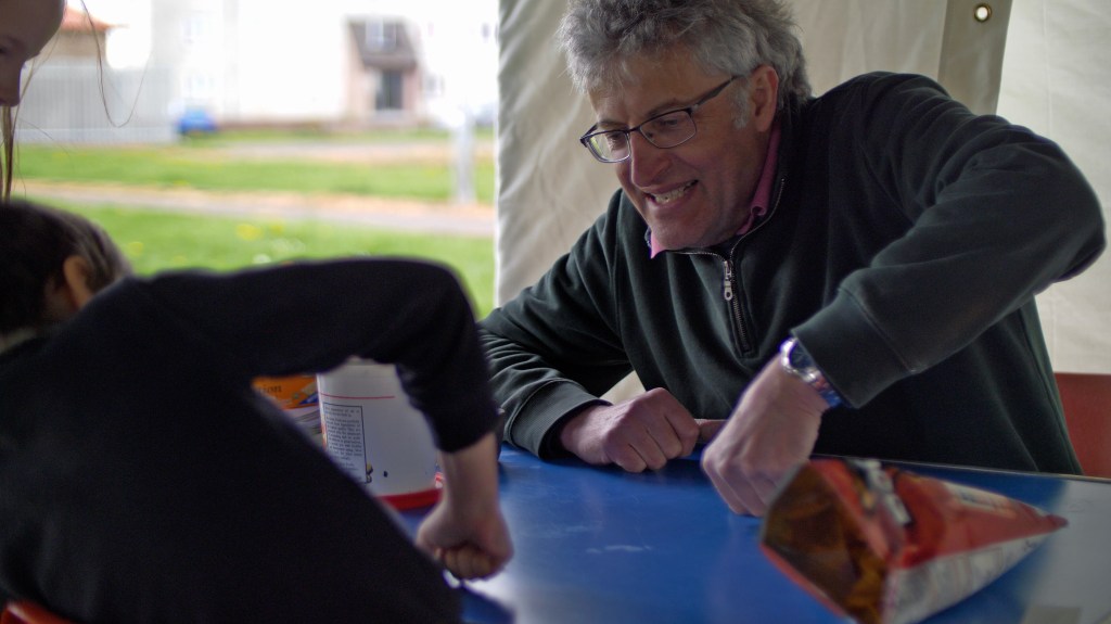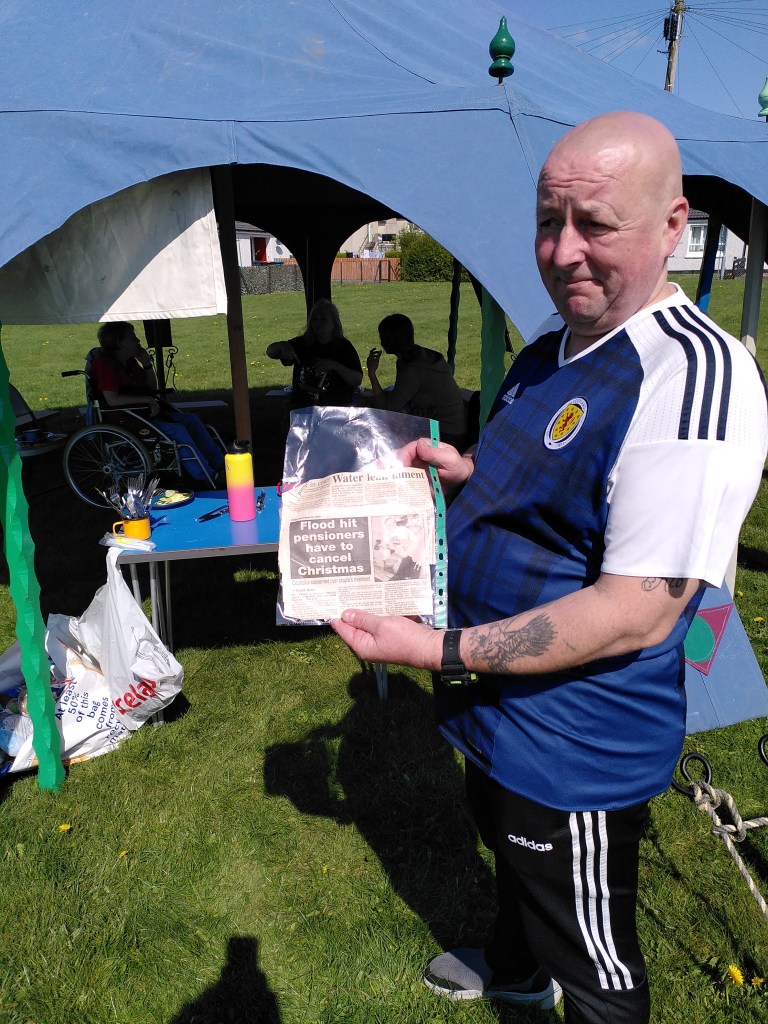 Rosie hammers in a tent peg in Burnett AveHaving a friendly chat with David the Police Community Support Officer for Lochside as we set up. He used to live in Lochside and has recently returned to contribute something positive to his old stomping ground. We explained our intentions to do something similar but from a very different perpective.Maria ponders inside the tent while Reggie tries to escape. We got to know her and her partner Paul last year at the Residents Consultation and they are now looking forward to moving with their three girls into a brand new house in Heathhall, having stayed 8 years in Dunlop Road.Davey shows a newspaper cutting from 2002 about flooding in Lochside – future food for thought? We had a long chat with Davey about the ongoing problems of flooding in the area and the hazard of sewage for playing kids. Davey was very passionate about it and has written many letters to the council over the past two decades. We listened intently and then Alice asked him if he had heard about reed beds naturally purifying contaminated water. That was new to Davey and perhaps opended a sideways approach to the whole issue, rather than an unwinnable fight with the council. We are still thinking about how we could use this issue for future creative work in the community…our role as artists must include thinking laterally but also practically, and always asking fresh questions.