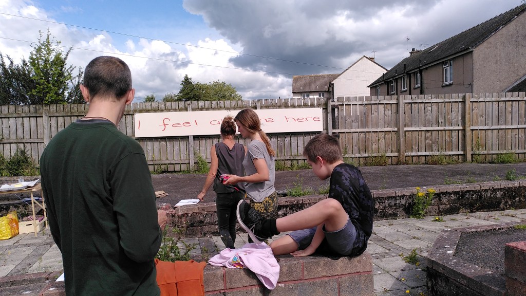Now it’s true we could simply carry on with using the tent for pop-up events or we could make temporary prints to hang on fences and from residents’ windows. And we are doing these things. But this by itself would be a betrayal of our initial vision for the area – making bold visual statements with the community for the enrichment of the community.