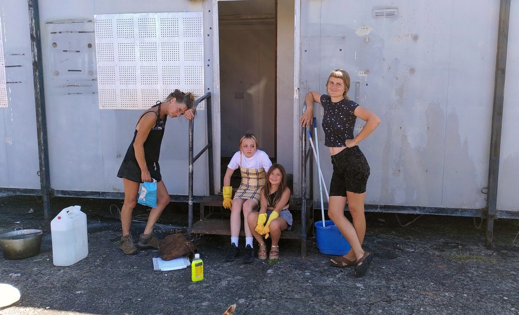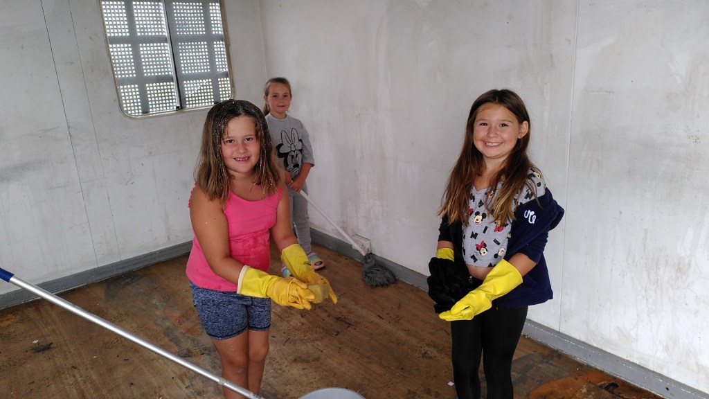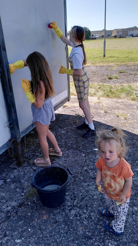 Rosie and younger team members cleaning the outside of the Art Cabin