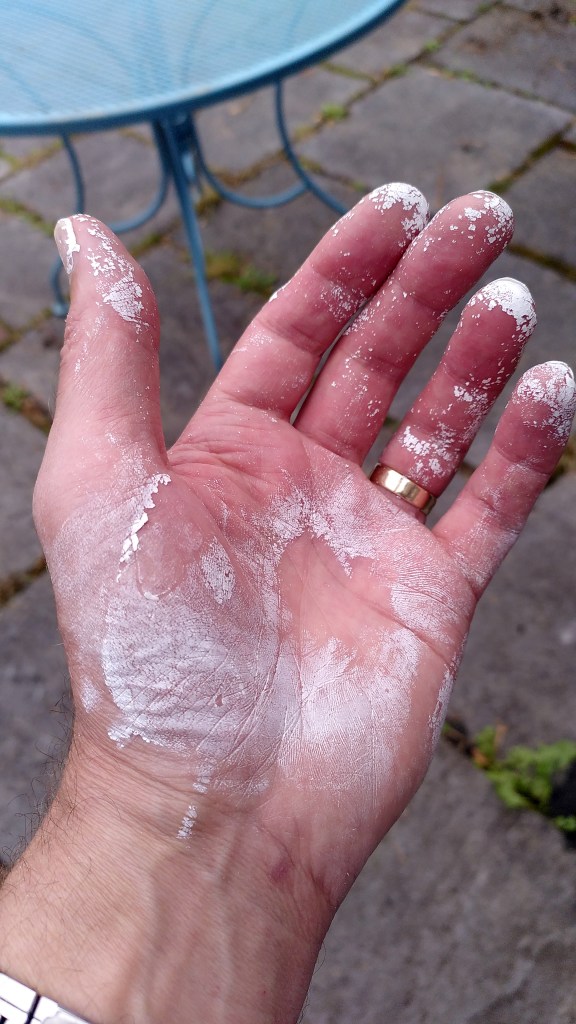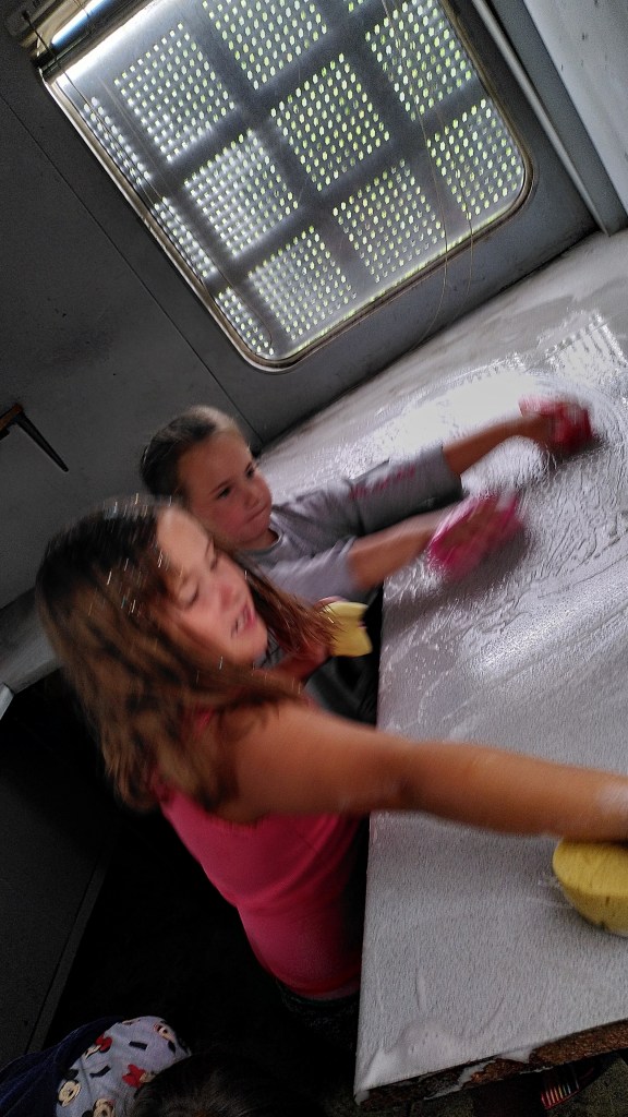 Cleaning worktops with energy and lots of soap…and Reggie the dog putting up with Alice