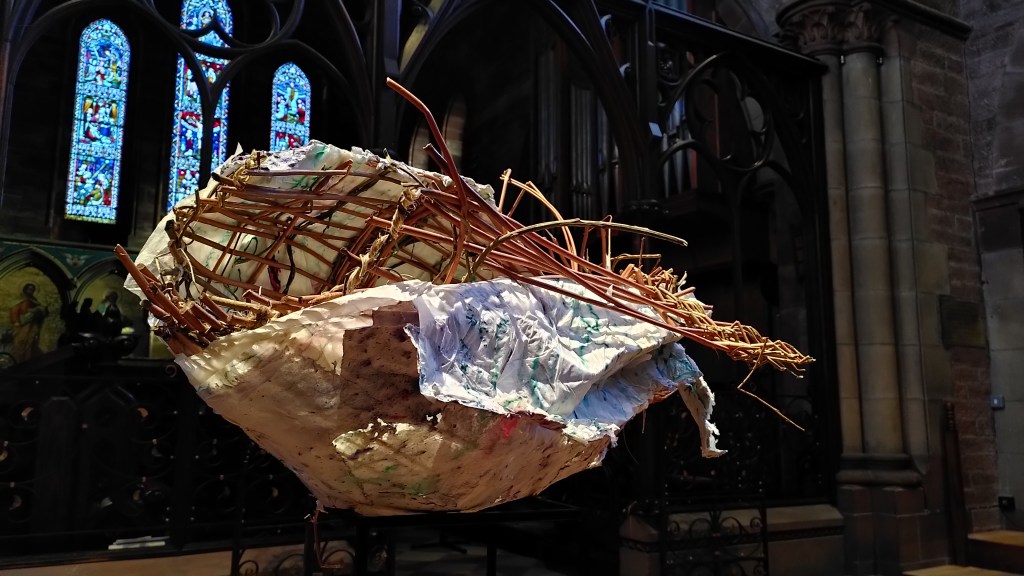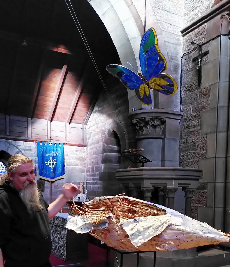 The concept was simple – a wicker and paper cocoon which is gradually built up over the six weeks of Lent to become a chrysalis, from which a stained glass butterfly emerges for Easter Day. The design of the butterfly made direct reference to the yellow and blue of the Ukrainian flag.