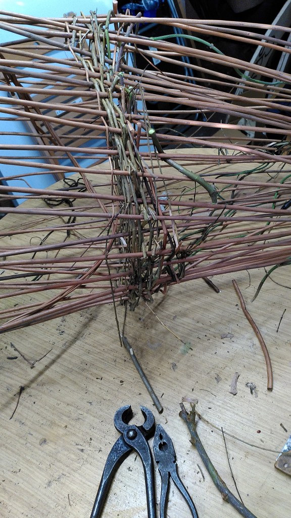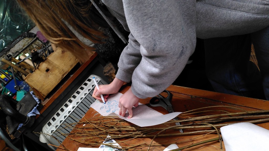 Simon and Alison help create the wicker armature for the cocoon.