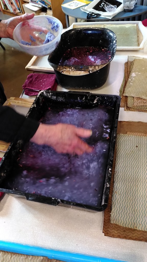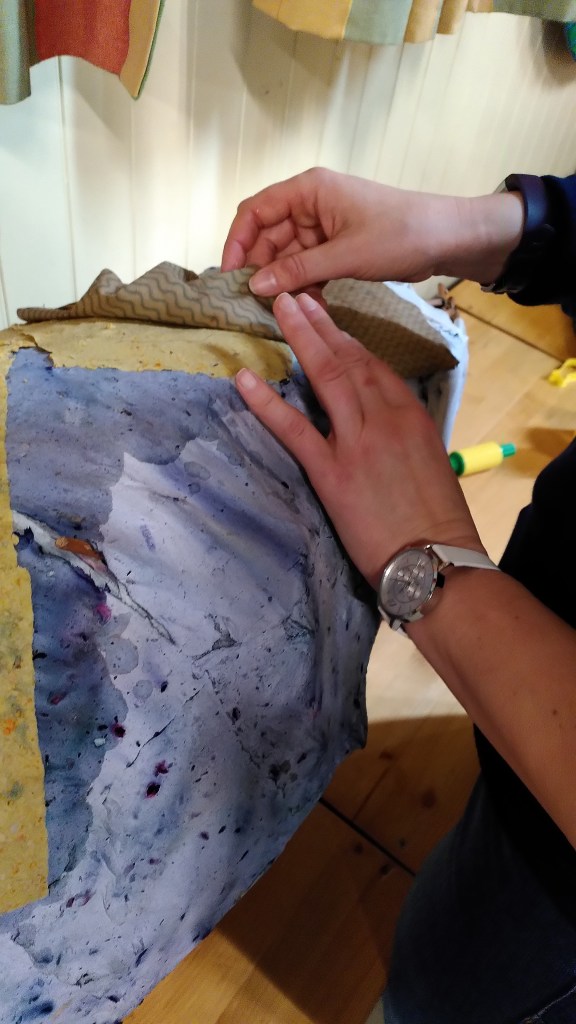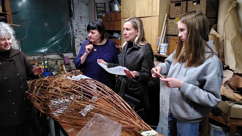 Alison explains to our Ukrainian friends how to apply the strips of paper to the wicker frame wth plenty of pva glue!