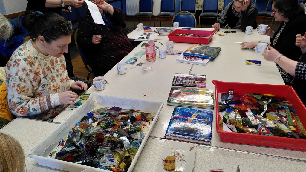 I was given the final session on the theme of coloured glass, having worked our way through drawing, calligraphy and textile weaving. In the final session the aim was to move somewhere beyond the verbal, representational realm into the more abstract world of shapes and colours and the quality of light itself…