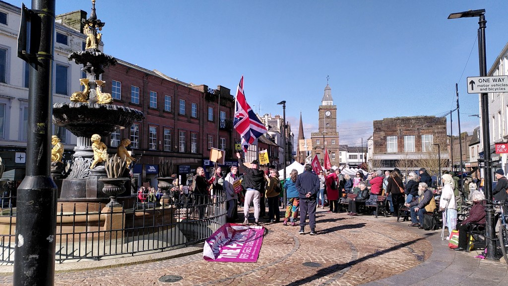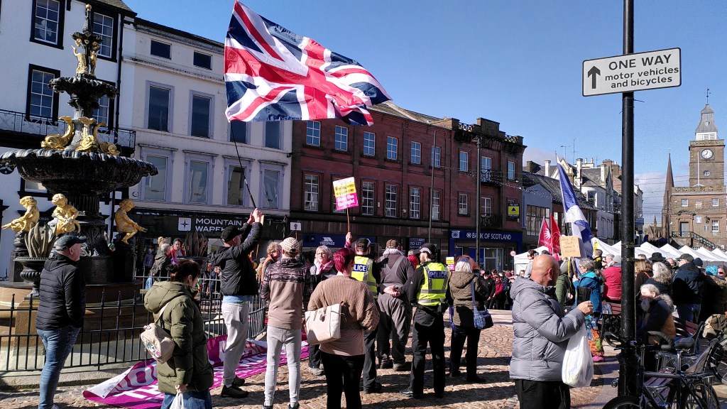 The photo captures a rally in support of young male asylum seekers here in Dumfries – from slightly to the side of the assembled crowd. A man is standing with a union jack flag in open defiance of the intentions of all the other protesters as if his actions can in some way oppose what they are standing for. But as I observed him and listened to the calm reason of the words of the speakers the union jack took on a more neutral symbolism. Watched by the two police officers who allowed it to remain as long as the standard-bearer remained quiet, it turned into a mere flag again. From being the index of hatred and zenophobia it has become in recent years, it bacame a benign presence, another facet of the positive community occasion, even a national stamp of approval.